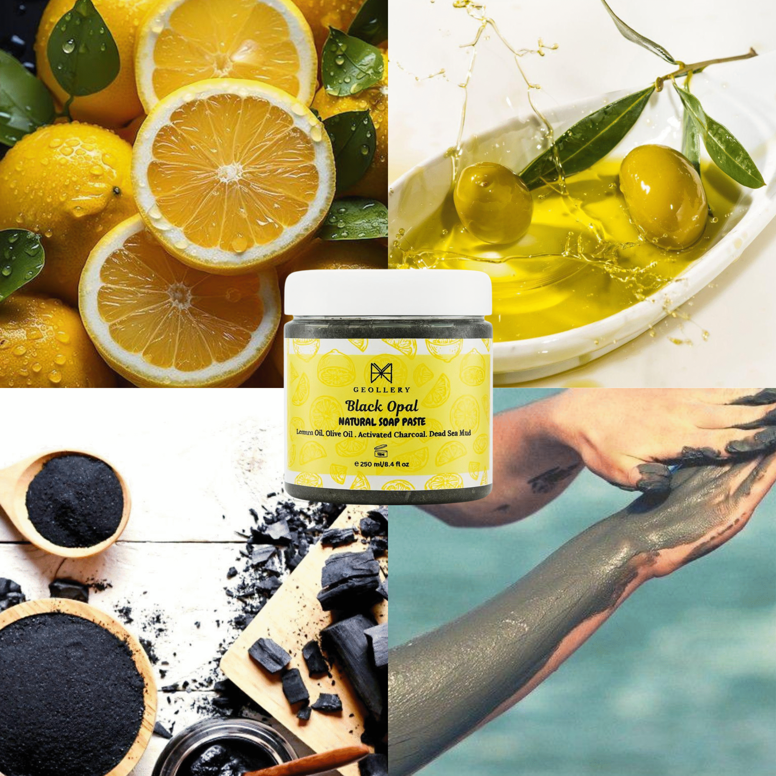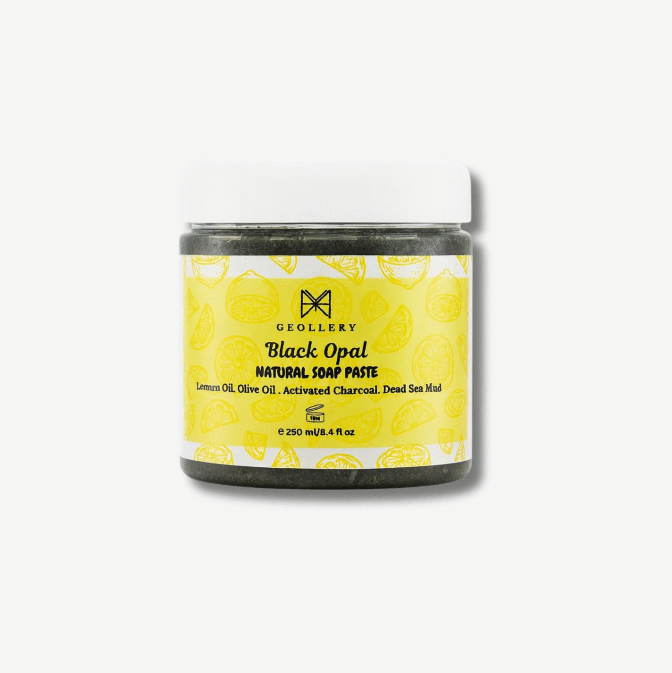 Natural soap paste with dead sea mud, activated charcoal, olive oil and lemon oil.